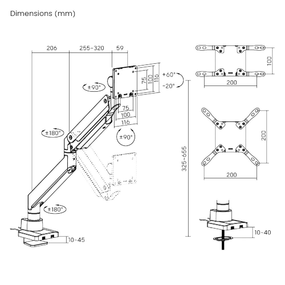 • Platzsparende Montage – Befestigen Sie die Halterung sicher mit der mitgelieferten Tischklemme oder Durchtischmontage, um Ihren Arbeitsplatz ordentlich und organisiert zu halten.