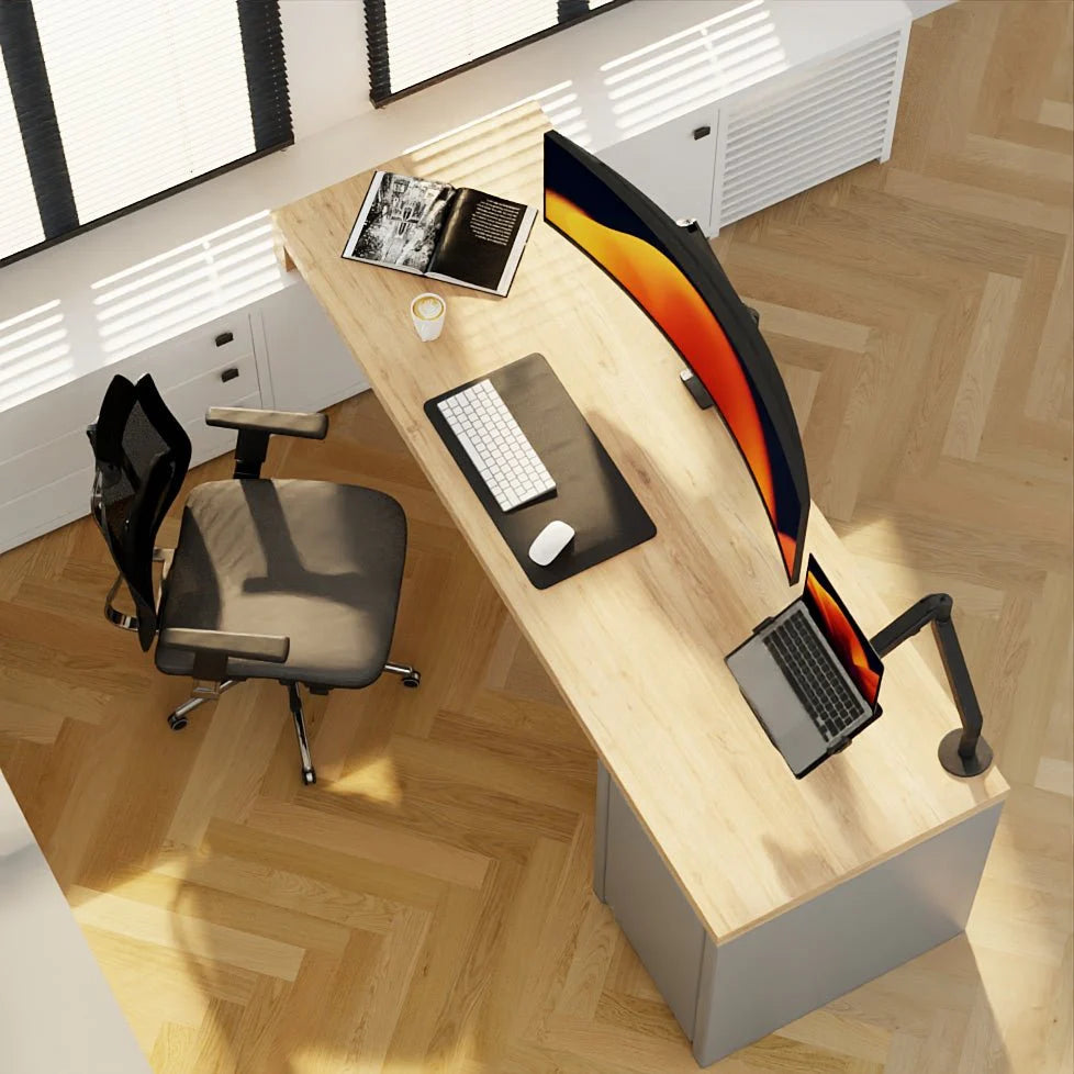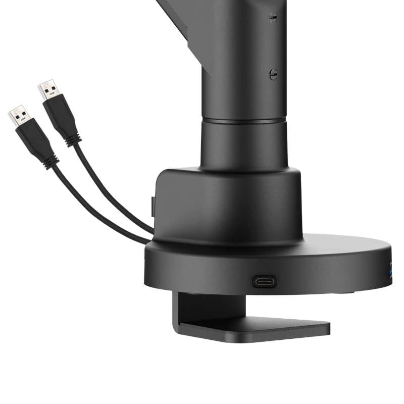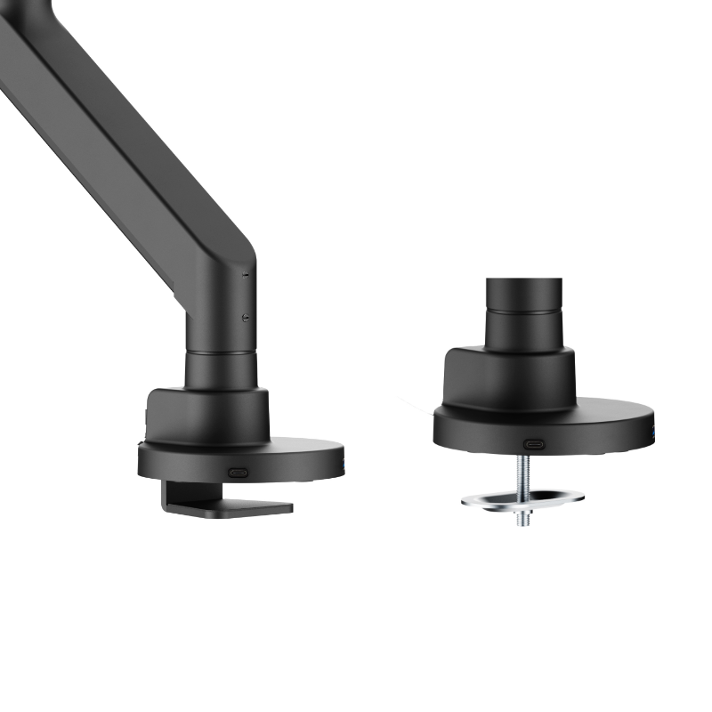 • Eingebaute USB-A & USB-C Anschlüsse – Laden Sie Geräte oder verbinden Sie Peripheriegeräte direkt über den Monitorarm.