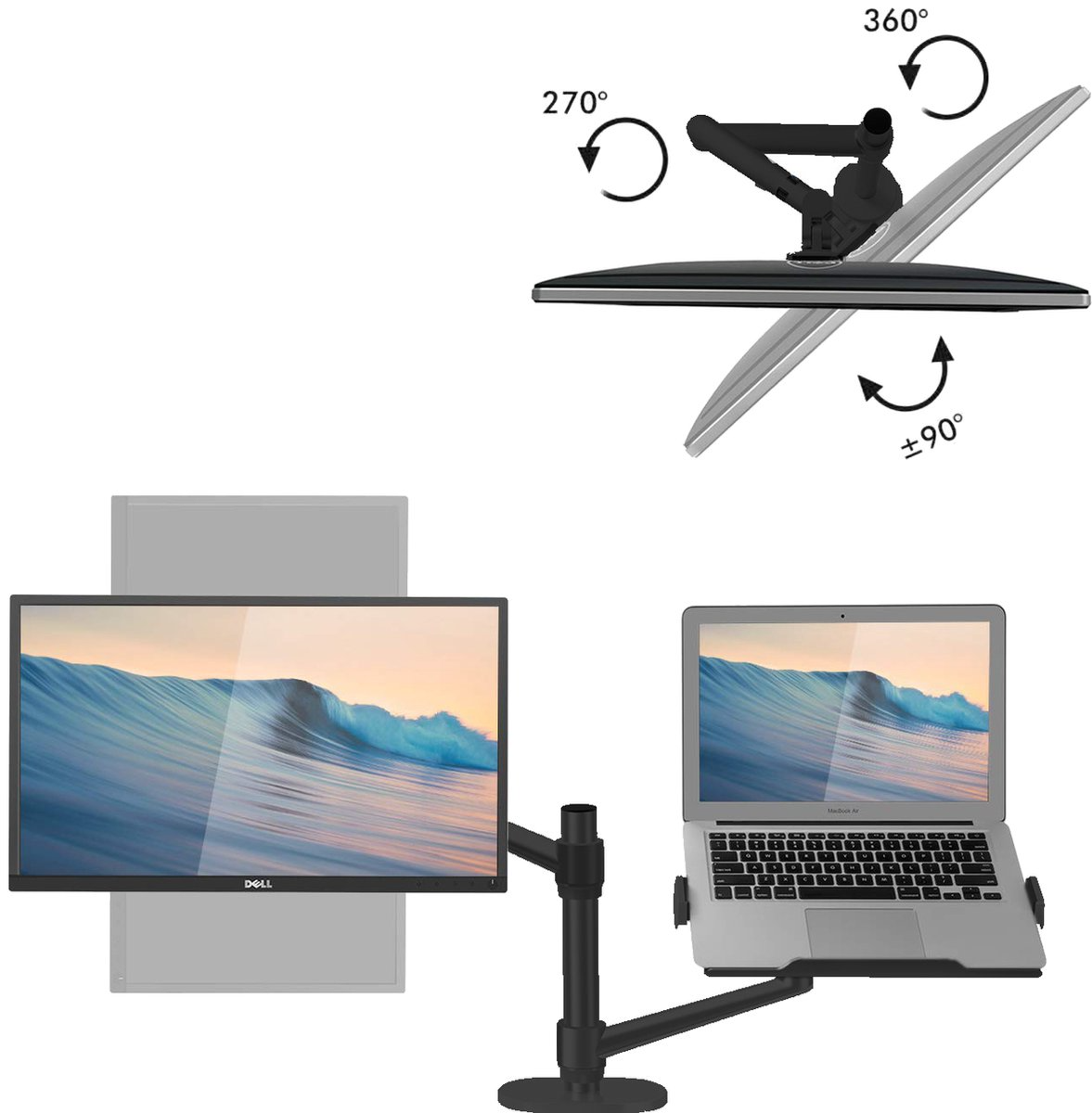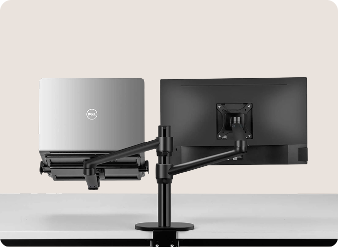 Hält sowohl einen Monitor (bis zu 32", VESA 75×75 / 100×100) als auch ein Laptop – separate Ständer sind nicht nötig.