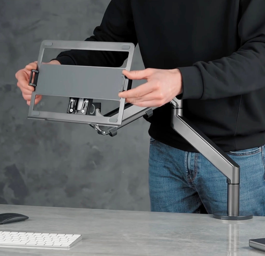 Mit seinem stabilen und stilvollen Design in elegantem Dunkelgrau fügt sich dieser Laptop Arm nahtlos in jede moderne Arbeitsumgebung ein – egal ob im Büro oder im Homeoffice. Er ist für Laptops bis zu 17 Zoll und 8 kg ausgelegt und bietet die ideale Lösung für Profis, Kreative und Remote-Worker, die Ergonomie und Ästhetik gleichermaßen schätzen.