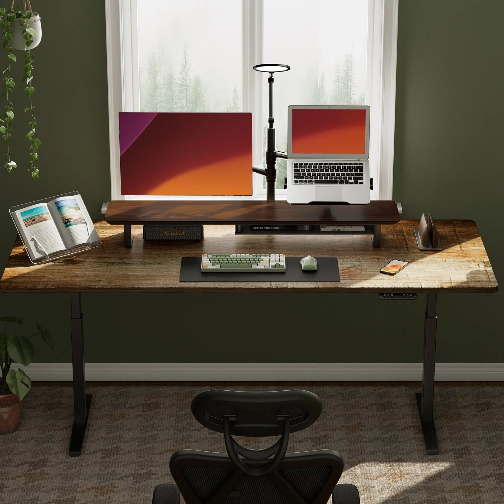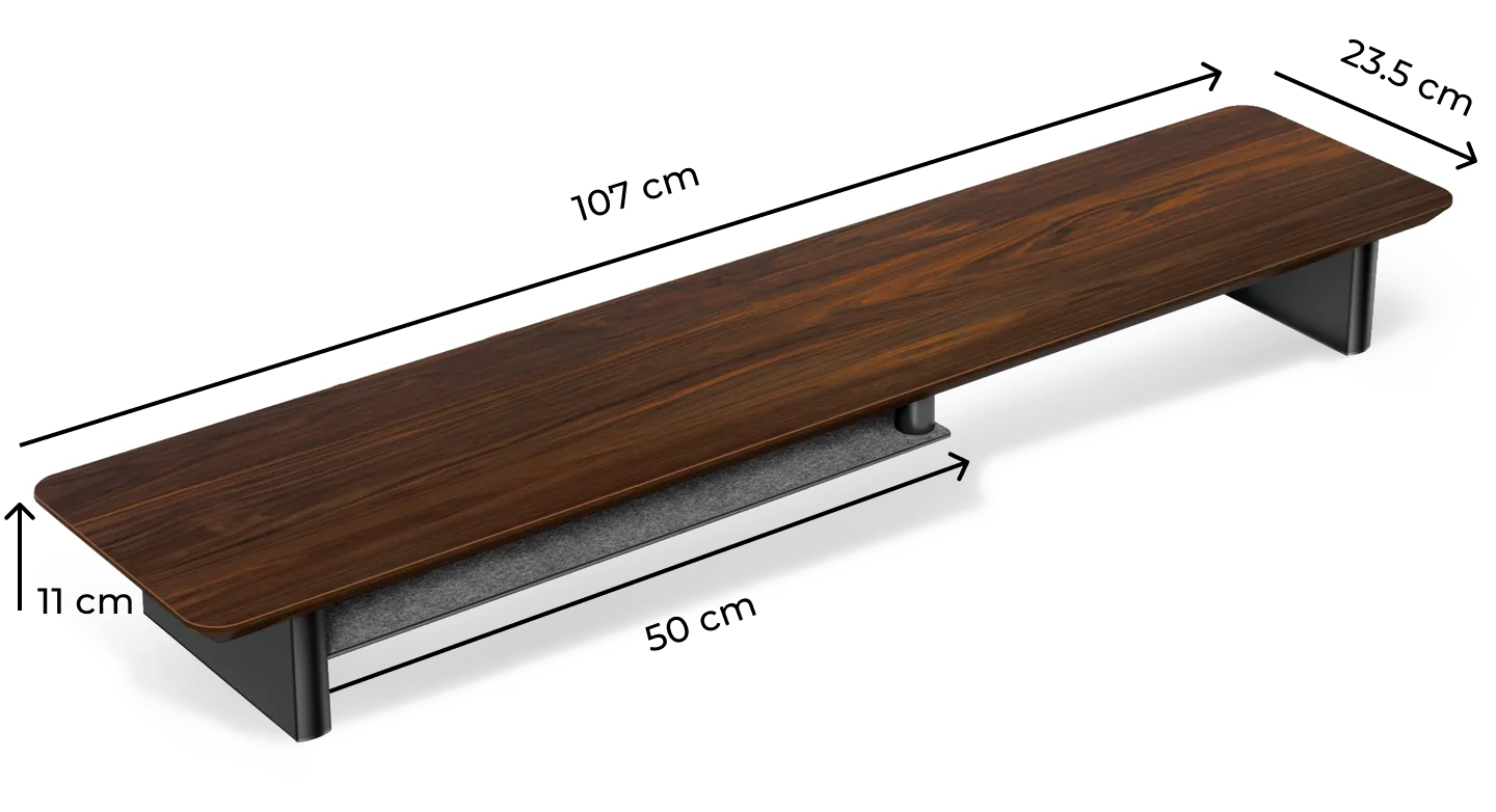 Mit einer großzügigen Breite von 107 cm bietet er problemlos Platz für zwei Monitore bis zu 27 Zoll oder einen Ultrawide-Monitor bis zu 49 Zoll. Der offene Raum darunter ist ideal, um Tastatur und Maus zu verstauen, damit dein Schreibtisch ordentlich und aufgeräumt bleibt. Dank der stabilen, langlebigen Bauweise trägt er bis zu 30 kg und ist damit perfekt für schwere Monitore oder mehrere Geräte geeignet. Die edle Walnuss-Oberfläche verleiht deinem Arbeitsplatz eine warme, hochwertige Note und sorgt dafür, dass das Arbeiten nicht nur bequemer, sondern auch stilvoller wird.
